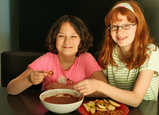 Grab some goodies for dipping and get snacking! We had pretzel twists and sliced apples this time. Bananas, pineapple, or strawberries would be tasty, too. We’re thinking this chocolate yogurt would add a fun twist to yogurt, granola, fruit parfaits, too!