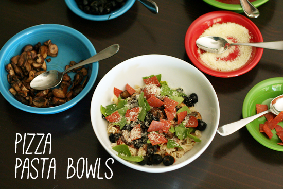 Drain the pasta and toss it with a little olive oil to keep it from sticking. Then, it’s time for everyone to create their own delicious pizza pasta bowl!