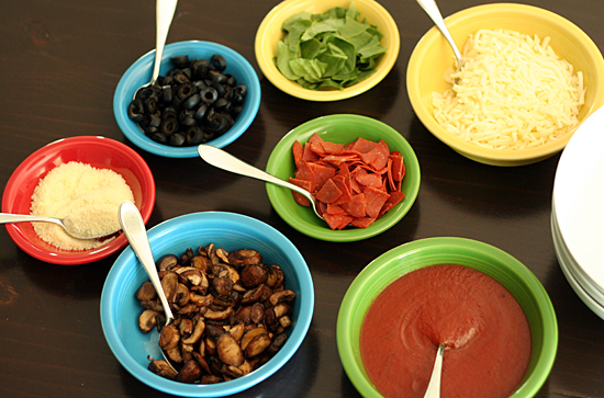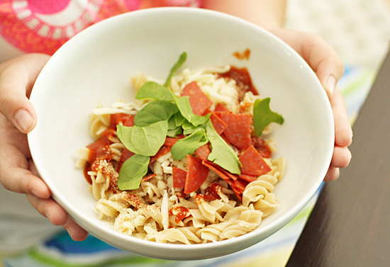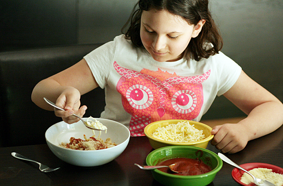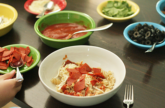 Give everyone a bowl of noodles and pass around the toppings. My girls love loading on extra cheese, but they also tend to include more veggies than they normally eat on pizza. I don’t even bother sautéing the spinach – the warm noodles will wilt it just enough.