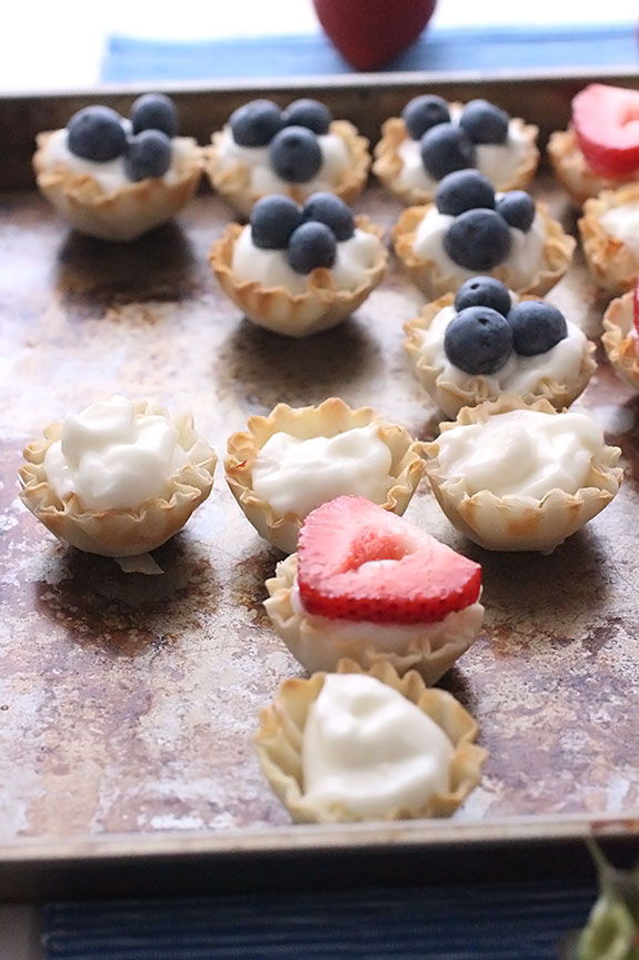 To assemble the tarts, arrange the mini phyllo shells on a baking sheet or large rectangular serving platter in a 6 x 7 pattern. Fill each mini tart shell with about a tablespoon of the prepared pudding and cream filling. Decorate the tops of the filled tart shells with fresh blueberries and thinly sliced strawberries to create the stars and strips of the American flag. Refrigerate the tart shells until ready to serve. Enjoy!
