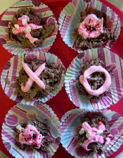 Mix round cereal into melted candy until covered. Spoon into mini cupcake liners (I turned my liners inside-out so the printed part would show around the candy.)
