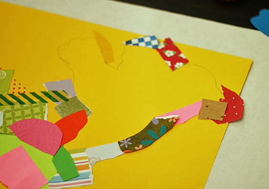Now it’s time to get busy cutting and tearing paper to collage. Fill the entire paper, except for your shape, with overlapping pieces of paper, tape, and other flat materials. My girls mostly tore their pieces, except when they needed a specific curve or edge to go around the outline of their shapes.
