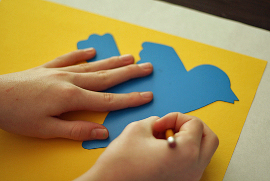 Choose a color for your background paper – this will be the color of your negative space shape when your collage is finished. Decide what shape will be the negative space in your collage. Simple large shapes are easier to collage around than small, intricate shapes. If you are doing this project with little ones, a circle, heart, or triangle might be good to try. Older kids might like to work with a more challenging shape, like a flower, animal, hand, or initial.