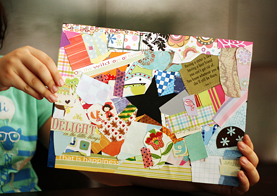 This is a great project for a hot afternoon inside. It took my girls about 45 minutes to complete their collages – lots of sifting through the paper scraps, cutting, tearing, gluing, and chatting!