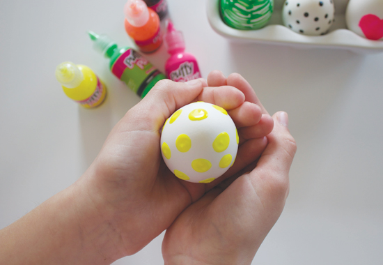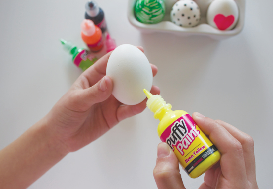 This is a really simple project that you and your children will love doing together. Plus, the colors are a nice departure from the typical pastels we usually see this time of year and will look great as decoration on your Easter dinner table. Happy decorating with Puffy Paint Easter Eggs!