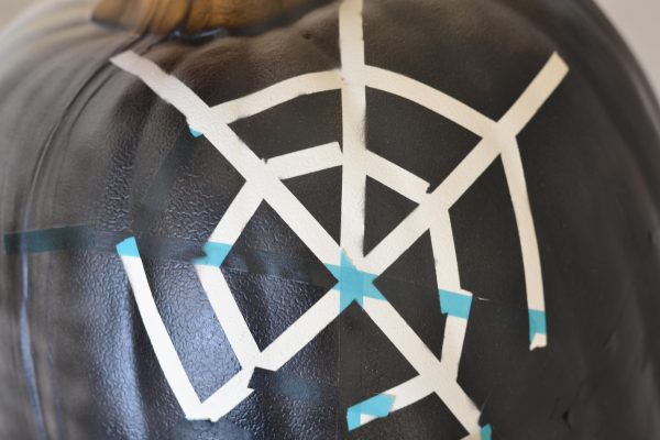 First you will want to make your spider web design with the washi tape. Make sure ALL your edges/tape is really pressed down on the foam pumpkin.