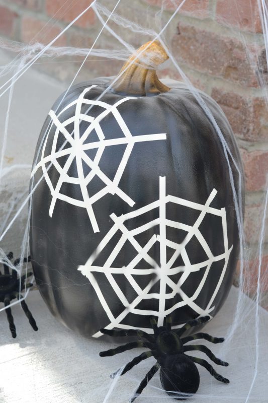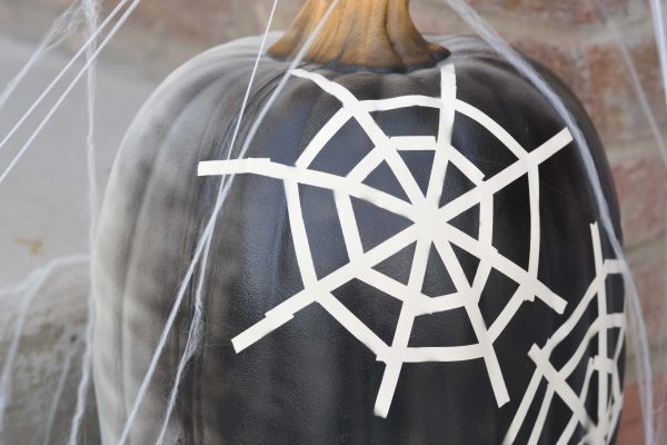 Once the paint is dry, you are ready for the final step! Simply peel away the washi tape to reveal the spider web design underneath. At this point you can add touch-ups if needed OR add other embellishments {think glitter, rhinestones or even some plastic spiders.}
