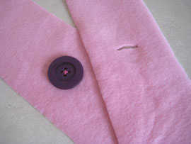 Option 1 – For my scarf, (warning: I did have to sew this button on, but I didn’t use a sewing machine!) I sewed a button on one side, 16 inches up from the bottom. Then I cut a small 1/2 inch slit on the opposite side, also 16 inches up from the bottom (with fleece, when you cut a slit, there is no fraying, so the button hole is good as is with no sewing.) Then I slipped the button through the hole. Having this button will help your scarf stay tight to your neck and keep you snug as a bug.