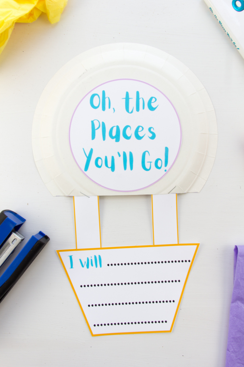 Cut the bottom section off the paper plate and staple the basket of the balloon into place. Glue the Oh, the Places You’ll Go circle onto the paper plate.