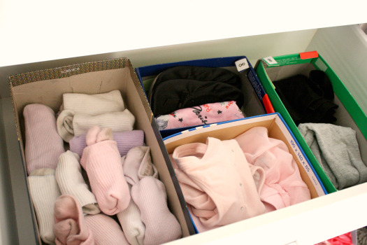 I love to use empty shoe boxes for all kinds of storage. They are a perfect little size, fairly sturdy, and a great way to recycle! I mainly use them to help organize my kid’s bedroom drawers. Socks, underpants, and even dance clothes all fit perfectly inside these handy dandy shoe boxes.