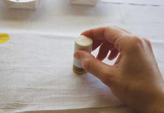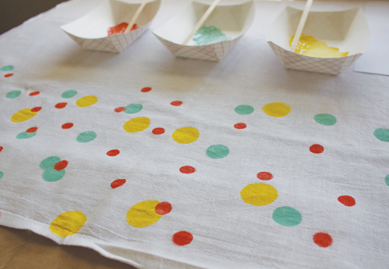 2. Next, simply dip the round foam sponges into the fabric paint and place on the dishtowel. Be sure to have a piece of cardboard underneath the dishtowel so the paint doesn’t seep through to your work surface. I found it helped to gently dab the foam sponge onto the dishtowel to get a more solid circle.