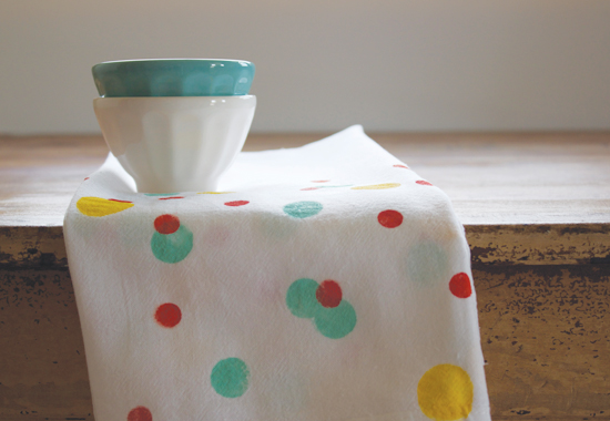 Flour sack dishtowels are my absolute favorite to use in the kitchen. They are absorbent and dry quickly. The problem? They don’t add much to the room as far as color goes. My solution is to add a bit of paint and fabric medium to customize the towels to your specific taste and color scheme. I whipped up a few of this confetti version during nap time and am so thrilled with the results!