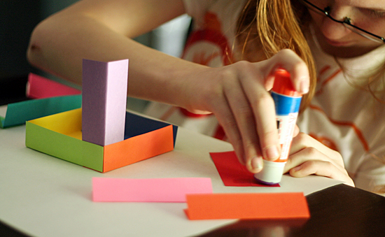 Here’s a fun craft-meets-construction activity to try, colorful paper cube sculptures. With just paper and glue, you can create 3-D cubes that can be stacked or glued together to create a larger sculpture. Once you show your kids the simple technique, they will be able to make a cube in just minutes.