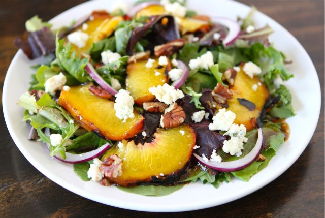 I drizzle the peaches with sweet honey and grill them until soft, tender, and juicy! I cut the peaches in slices and add them to mixed greens. For added flavor, I toss in crumbled blue cheese, pecans, and red onion. I dress the salad with a simple balsamic dressing, but feel free to use your favorite dressing.