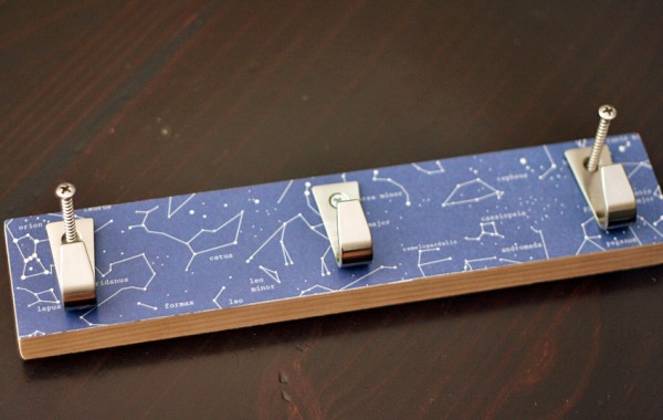 Start with a board cut to size for your project. Our board is 2.5″x12″, and about an inch thick. Choose and cut a piece of scrapbook paper (or other patterned paper) to fit the board. The paper is what makes this hook rack special, so let your child choose something that reflects his/her interests or style. You could even use a piece of your child’s artwork! My daughter chose this fun constellation paper for her hooks.
