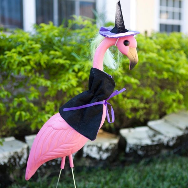 - OR if you have any doll costumes laying around with a witch hat and cape, these would fit perfectly around your pink flamingo!