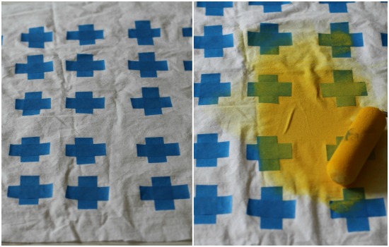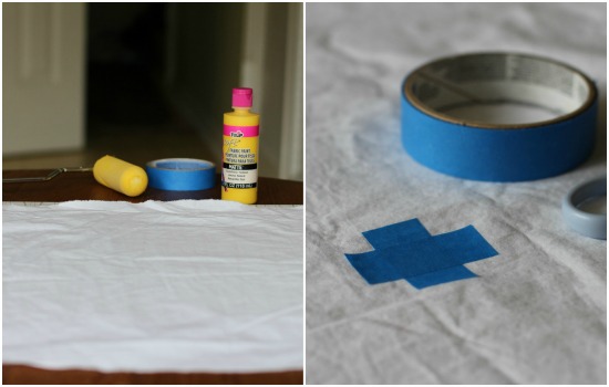 Once you have created as many cross shapes and rows as you wish, you are all ready to paint! Distribute a good amount of fabric paint in a shallow container and dip your roller brush in the paint. Begin painting being careful not to pull up any of the tape edges as you are rolling.