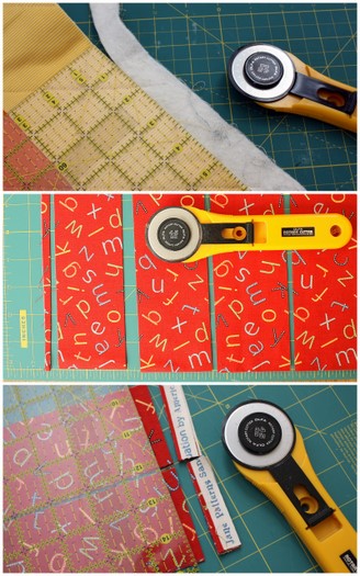 Next cut you binding strips: Four 2 ½” wide (x width of the fabric) strips will be just enough to bind your baby quilt. [To find the amount of strips you will need for a bigger quilt, find the measurement of the perimeter of your quilt. Divide that number by 42 – for the roughly 42″ of the width of the fabric – and cut that number of strips. For example: if your quilt measures 55″ x 80″ find the perimeter: 55+55+80+80=270. Divide 270 by 42 = 6.4286. Because the number is bigger than 6 you will need 7 2 ½”x42″ strips to have enough to go all the way around. Does that make sense?]