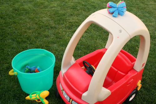 - Time to Wash the Car – Get all the toy bikes and cars out on the lawn for a good washing. We used water guns and these Water Sponge Toys to scrub them down.