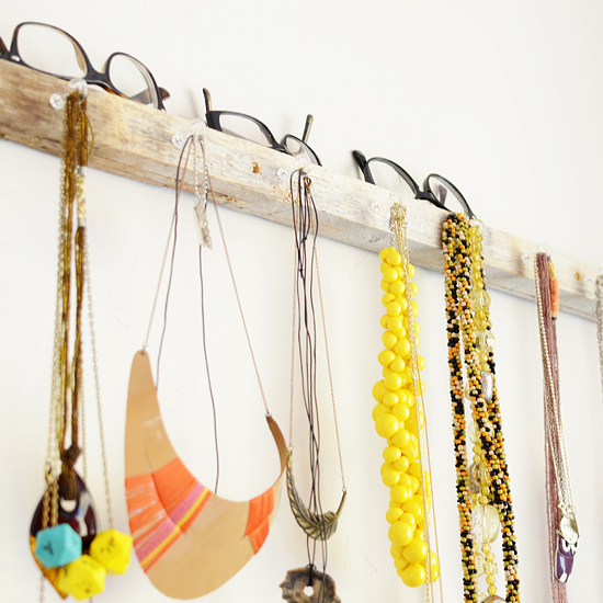 When cleaning up our side yard I came across a few weathered strips of wood. I knew at least one had to go on my wall. I cut one down to size using a hand saw (too lazy to get out the power tools on Saturday). I mounted the wood onto studs and pushed these rad little pin hooks into the soft pine. This project took about 2-3 hours, by myself. You could cut down your DIY time by at least half by having another adult help out and by having your jewelry already organized, ready to hang.