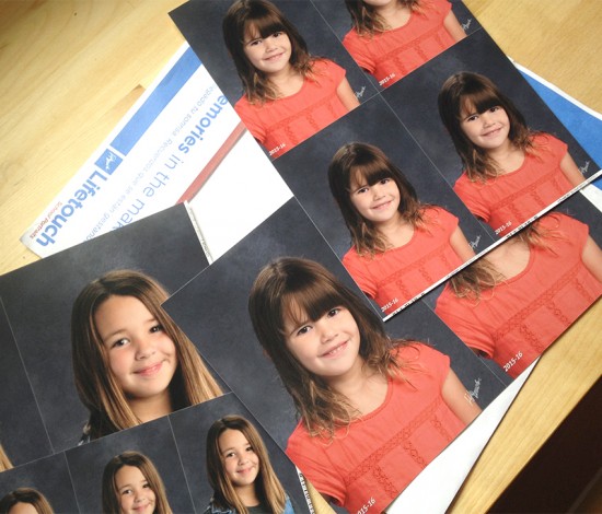 Typically, I put the largest school picture in a scrapbook page facing the class picture and call it good. And then I’m left with a dozen wallet size and 5×7’s that just end up in a box. I always mean to send them to family or trade with friends, but typically forget.