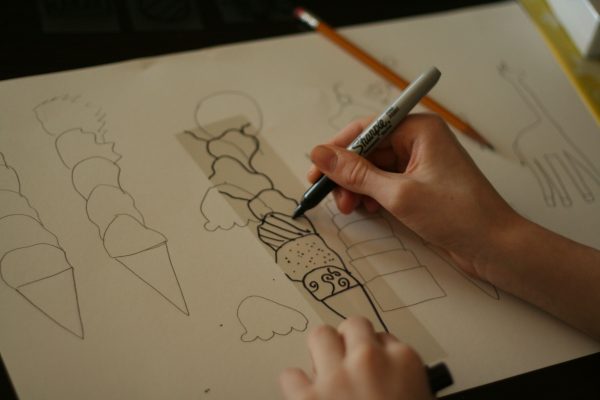 It’s also fun to take advantage of the bookmark’s tall shape. We brainstormed tall things to draw, like layer cakes, ice cream cones, crazy houses, giraffes, hot air balloons, sunflowers, trees, and mountains. I love this wacky, Seuss-inspired house my 12-year-old came up with!