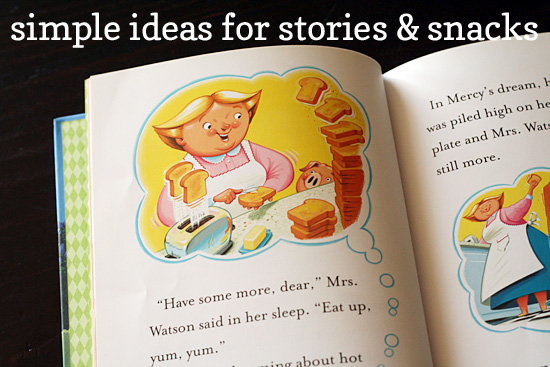 It was always especially fun when there was a food to go along with one of our stories, like silver dollar pancakes while reading If You Give a Pig a Pancake or vegetable soup just like the birthday soup in Little Bear. Here are five fun and simple book and food pairings for your own story snack time!