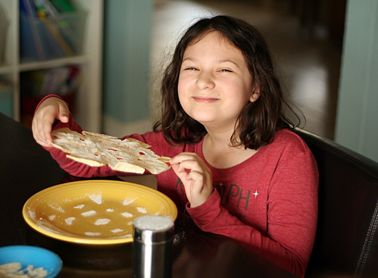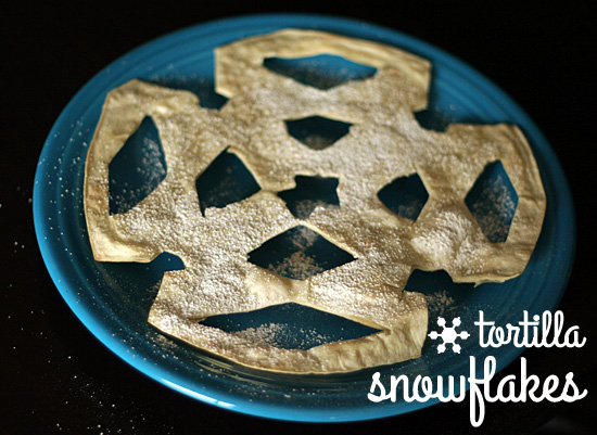 My daughters have been reminding me that we forgot to cut paper snowflakes during our December advent activities. So, I knew they would enjoy this snack-time surprise – making crunchy tortilla snowflakes dusted with powdered sugar. These are so simple and fun to make, perfect for a cold winter day when you’re stuck inside.