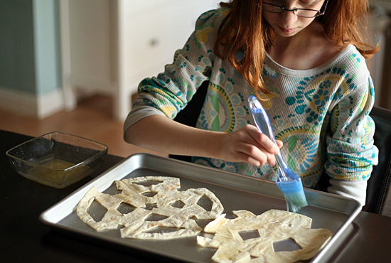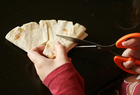 Preheat oven to 400°. Find some clean scissors for cutting your tortillas – I just washed a couple pairs in hot, soapy water and called them good.