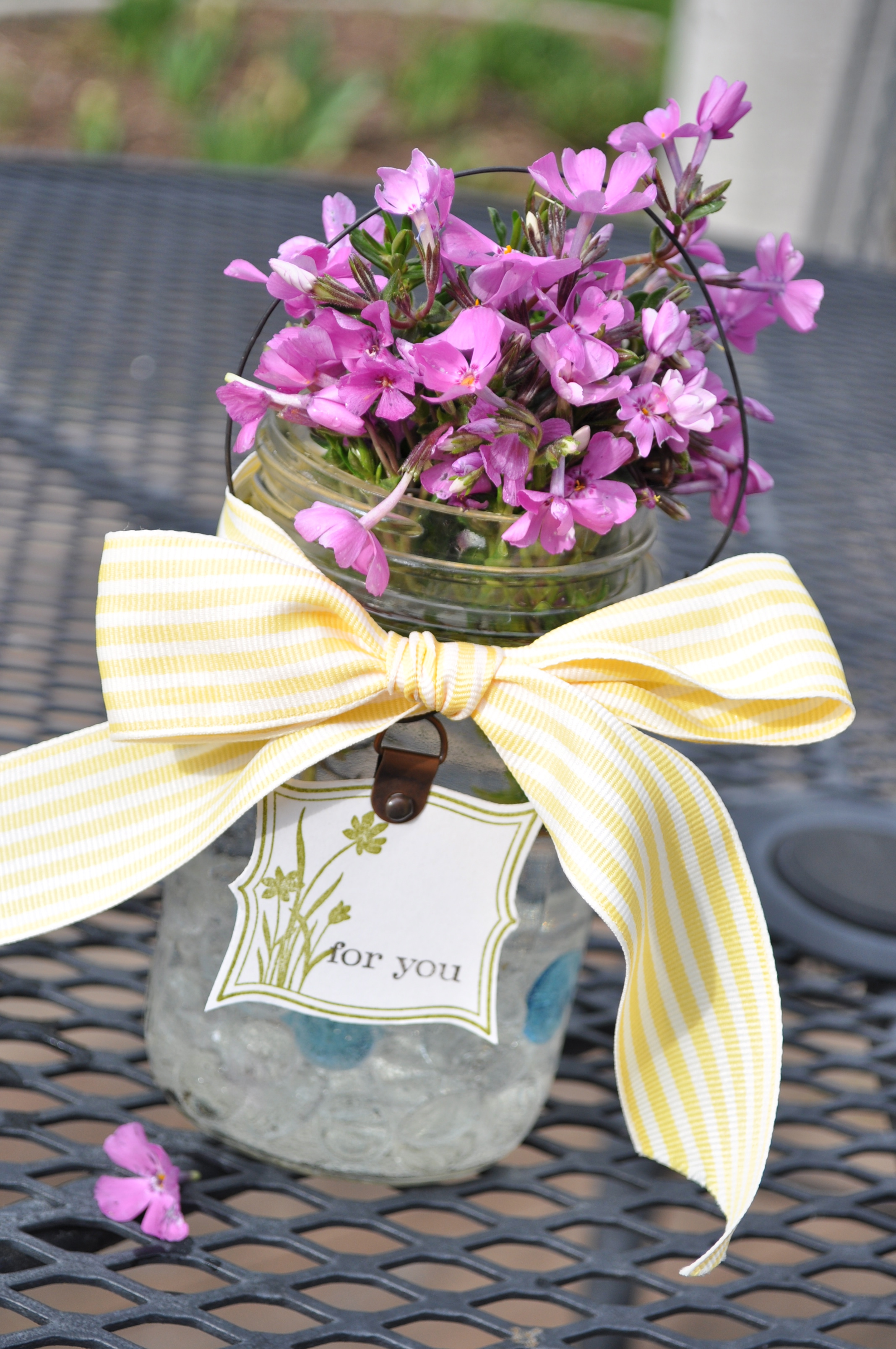 4. Hand stamp a tag: “just for you”, “thank you”, “Happy Mother’s day” etc. I hung it on the wire with a hardware piece (all tag supplies Stampin’ Up!).