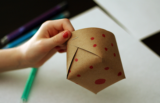 To fold your basket, pull the sides together, overlapping the corners in front of the center piece. Secure with a staple and repeat on the other side. It’s tricky to explain, but not tricky to do! Use the picture below to see how it should look.