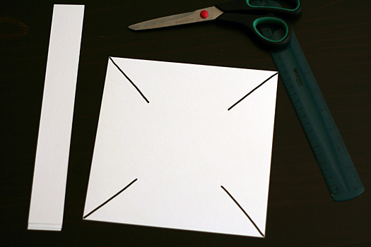 Start with an 8-inch square piece of paper and a strip of paper for a handle. Make a cut from each corner toward the center, about 3.5″ long (see picture below). I measured out one square and used it as my template to cut the rest of our baskets.