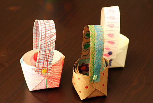 Now it’s time to decorate your basket anyway you choose – crayons, markers, paint, stamps, etc. Some of your design will get covered when you fold your basket, so an all-over or random design works really well. Decorate both sides if you like.