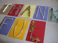 Cut colored paper into half sheets. In pencil, write one letter onto each colored paper, spelling a Thanksgiving word, like: Thankful, Give Thanks, Thanksgiving. Collect “natural” items for forming letters. These natural items can include: dried cranberries, marshmallows, sticks, hay, leaves, raisins, popcorn, leaves. With craft glue, glue collected items onto the penciled letters. Let the glue dry completely.
