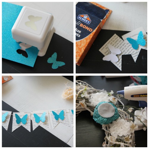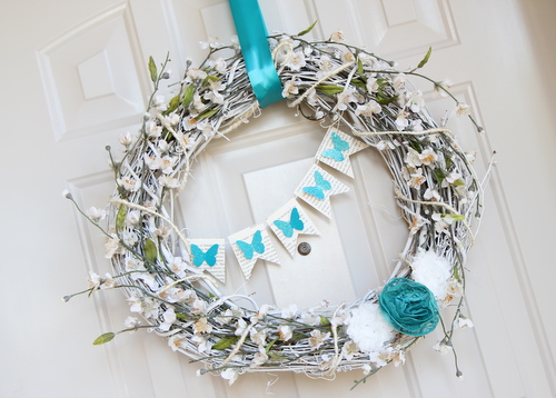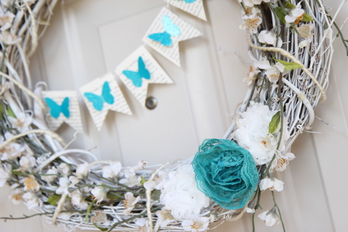 Next I punched out several butterflies and glued them to the center of the flags. The words “Spring” or flowers would be cute as centers too! Once my butterflies were glued on, I hot glued twine to the back of the flags. Then I hot glued the twine to the back of my wreath to hold up my bunting.