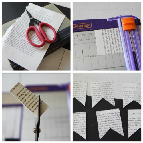 Bunting is such a fun/cheap addition to add to your wreath for any holiday. To make this one, you’ll need one page from an old book. I cut (6) squares out of the page (2×2.5 in) with my paper cutter. Then I cut the points off to create a little flag banner.