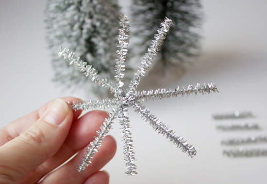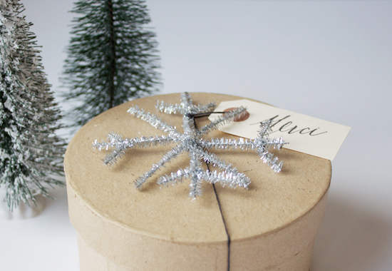 Every year about this time I start dreaming up how I’ll wrap up our Christmas gifts. While wandering through the craft store about a month ago I spied some silver tinsel pipe cleaners and thought they would be the perfect material to work with to create some inexpensive gift toppers. I love the way the pipe cleaners sparkle and instantly decided they had to be turned into snowflakes.