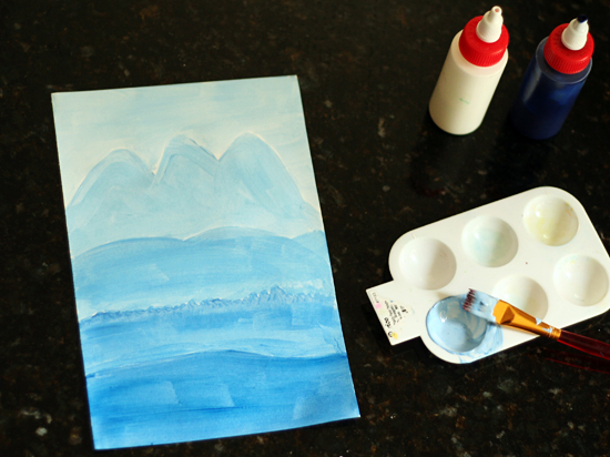 Lately, we’ve been experimenting with adding white to our basic colors, creating lighter color variations called tints. These tinted landscape paintings are a fun way for your school-age kids to experiment with mixing and painting with tints.