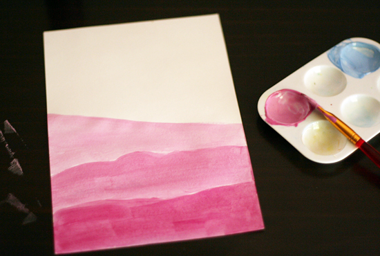 When your paintings are dry, you could add some simple silhouettes on top, either drawn with a black crayon or marker, or with shapes cut from black paper. Trees, small houses, or a few flying birds would be great details to add.