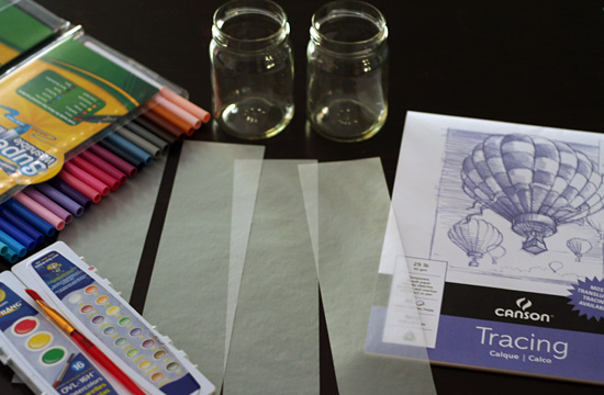 Cut your sheets of tracing paper into strips that will fit your jars. We used jelly jars from the recycle bin, and our strips were 3″ tall. Cut the length so each strip has just enough overlap to tape or glue closed once it’s on the jar.