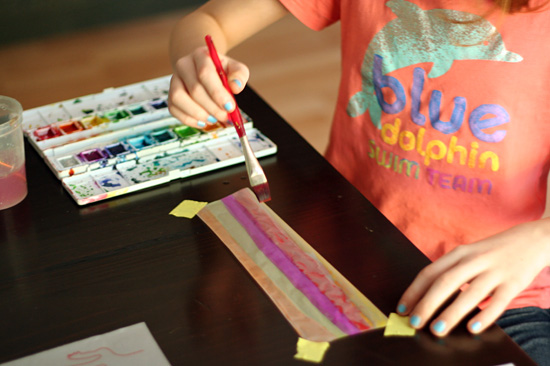 The watercolors will be the most finicky – tape down your strips before painting and make sure your brush is not too wet. We dabbed our brushes on a piece of scratch paper before painting on the tracing paper. The paper will want to curl, and it will wrinkle a bit, but once it dries it will look beautiful!
