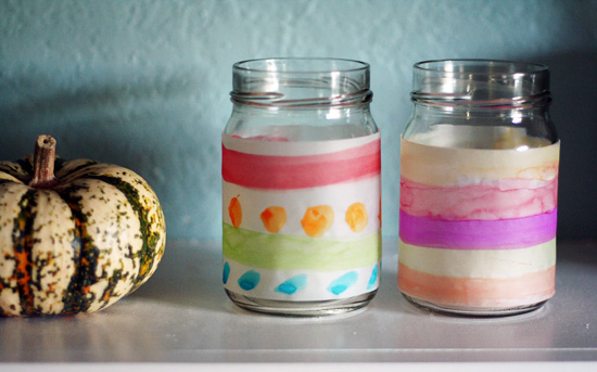 No jars around? No problem! Make a ring with your decorated strip, secure with tape, and set over a battery-powered tea light. These looked so pretty down the middle of our dining table. Thanksgiving centerpiece, perhaps?