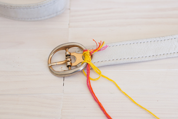 Now using the first color (in my case yellow) wrap and knot the thread around the buckle as shown, making sure to wrap around the threads that aren’t being used and carry them along as you work.