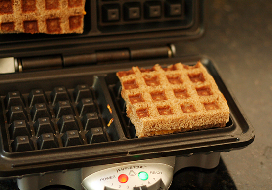Assemble sandwiches on a preheated waffle iron, just like you would make one in a pan – bread with butter-side down, cheese in the middle, and bread with butter-side up.