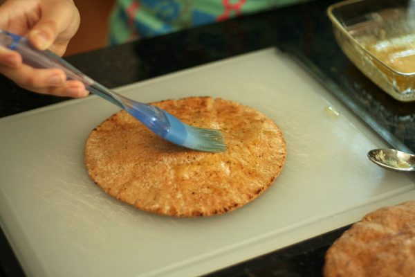 Melt the butter in a small dish or measuring cup. Stir in the garlic powder, Italian seasoning, and salt. Use a pastry brush to coat each pita bread with the seasoned butter. My kids have always loved jobs that involve the pastry brush – it’s like art time in the kitchen!
