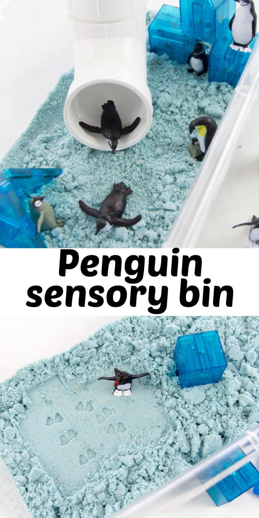 We absolutely love indoor winter activities for kids on cold, snowy days. Have you checked out our 15 snow day crafts, winter shred animals, or our yarn lacing penguin craft? Below, we are showing you how to set up a simple penguin sensory bin.