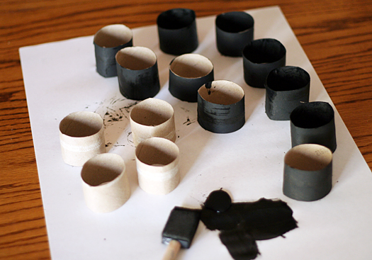 - For the painted bases, cut a cardboard paper towel tube into “slices” – ours were 1.5-2″ wide. Paint the cardboard rings, inside and out, with your choice of color. I recommend acrylic craft paint for good coverage. Set aside to dry.