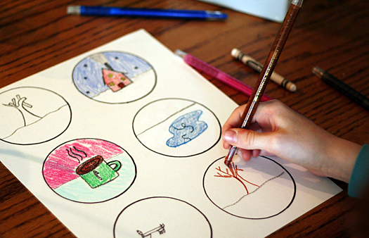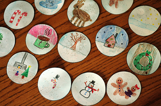 My kids made them for Christmas Eve dinner using the cardboard rolls left over from all that wrapping paper. I made large circles with a drawing program and printed them out on card stock. We skipped the step washing with water colors and used a blue-tinted glitter glue. I found that it’s best to color and glitter the full sheets and cut out the circles when dry; if you cut the circles first, the moisture makes them curl up. We did not have a lot of guests, so my two kids each made a drawing for each person and we put them back-to-back in the base. Adorable idea!!