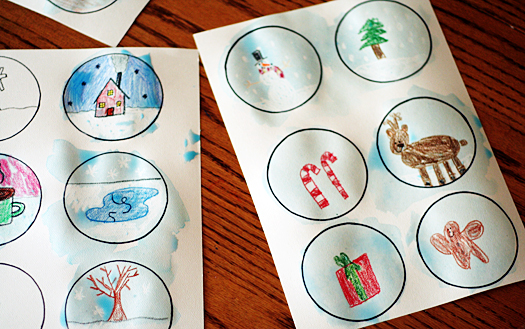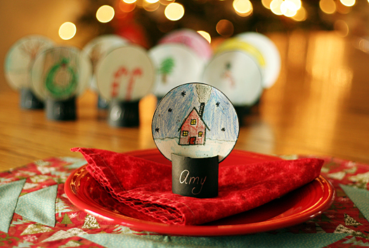 My girls love setting a fancy table any time of year. Holiday get-togethers are a perfect time to create some extra-special place cards, like our cute snow globes! We’re planning to use these for our winter solstice candlelight dinner, and take them to my parents’ house for Christmas Day.